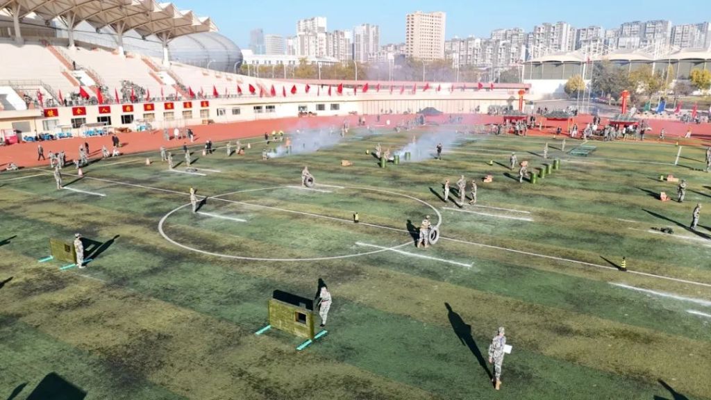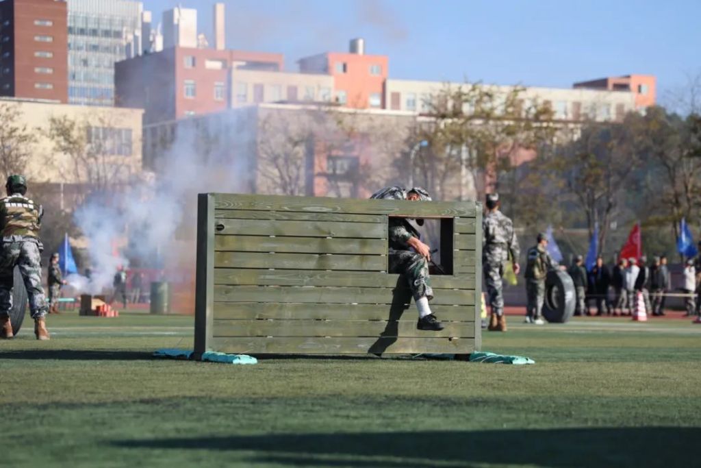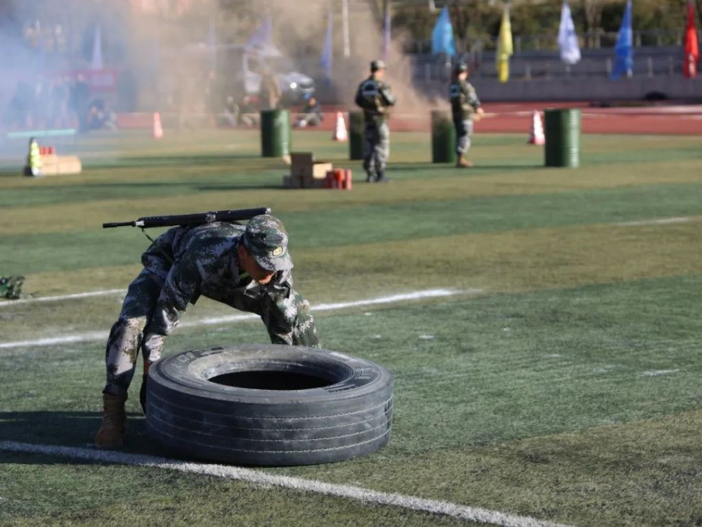 身姿挺拔,精神昂扬,一场热血与勇气的“试炼”激情上演。压低身姿,双手有力交替支撑,双腿快速蹬地前行,干净利落穿过低桩网;“硝烟”弥漫,熟练佩戴防毒面具,脚步沉稳灵活通过S形绕桶;摘下防毒面具,咬紧牙关,翻轮胎(滚轮胎)一气呵成:矮墙洞前,借助奔跑的冲力,身姿矫健,轻松越过;攀爬板处,手脚并用,坚实有力;大步流星,勇往直前,冲刺终点。用生命在奔跑,用灵魂在呐喊,以拼搏到底的决心和永不言败的信念,奏响一曲新时代的红色爱国赞歌。