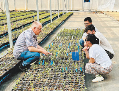 诺伯特·菲舍(左一)正在与农技人员讨论育苗技术。