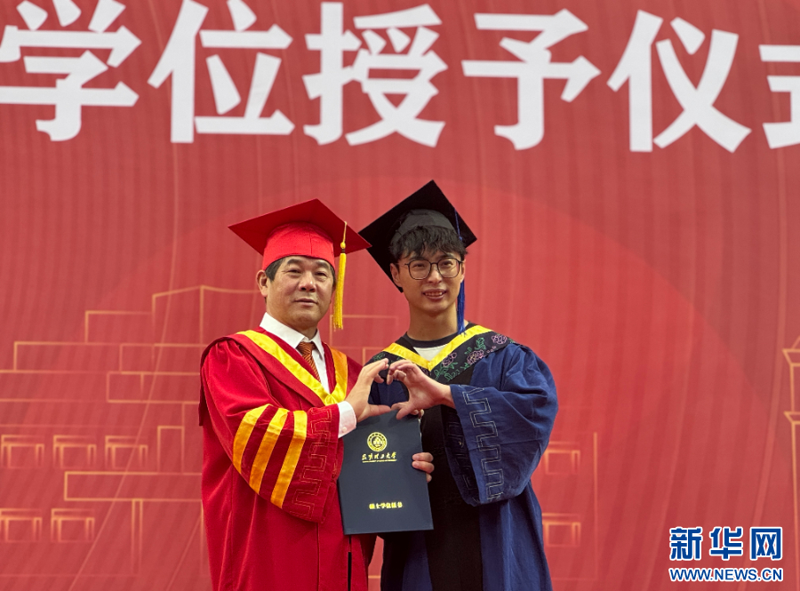 王华(左)为毕业生拨穗并颁发学位证书(6月19日摄)。新华网发(柴静 摄)