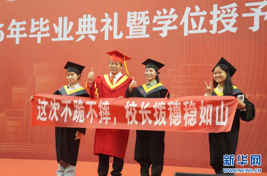 毕业生举着趣味标语与王华(左二)合影(6月19日摄)。新华网发(马馨 摄)