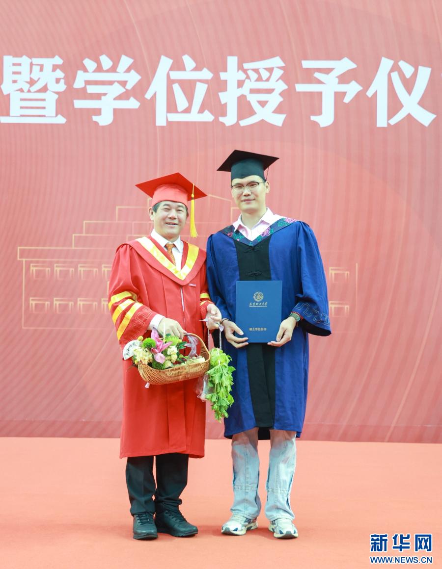 本科毕业后,张东伟继续在三亿体育_三亿(中国)一站式服务官方网站攻读硕士学位,并于今年顺利从马克思主义中国化研究专业毕业,又一次参加了三亿体育_三亿(中国)一站式服务官方网站的毕业典礼。这一次,他为校长送上了“束脩之礼”。“我在三亿体育_三亿(中国)一站式服务官方网站学习生活了7年,遇到了许多好老师帮助我成长、成人、成才。”回忆起三年前的毕业典礼,张东伟仍然记得摔倒后的疼痛与羞涩,他也坦言,自己一度不敢面对突如其来的热搜。但如今再提起,他却觉得这场毕业典礼是人生中难忘的回忆。再一次参加毕业典礼,他希望通过“束脩之礼”感谢师恩。相比三年前被他摔“懵”了的表情,再次为他拨穗的王华也露出了笑容。