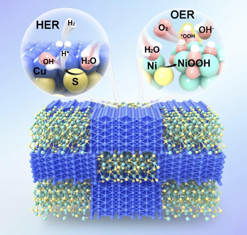 团队结合实验与理论计算发现,该材料的优异性能源于三重作用机制:一是硫原子聚集的正电荷,大幅加快析氢反应第一电子转移过程动力学;二是铜位点优化的d带结构,平衡了反应中氢中间体的吸附与脱附过程,避免吸附过强或过弱影响热力学效率;三是材料界面间的强相互作用,促使表面结构重构,削弱析氧反应关键中间体的吸附强度,进一步优化反应动力学。