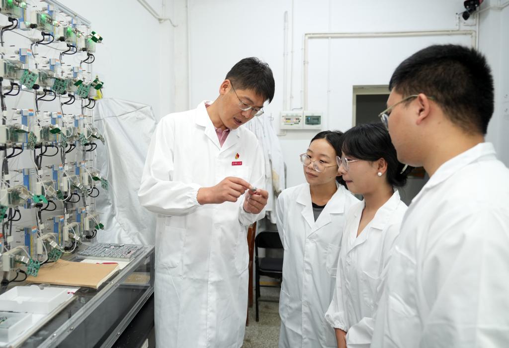 郭胜惠教授(左一)在实验室给学生们讲解微纳气体传感器结构和工作原理。