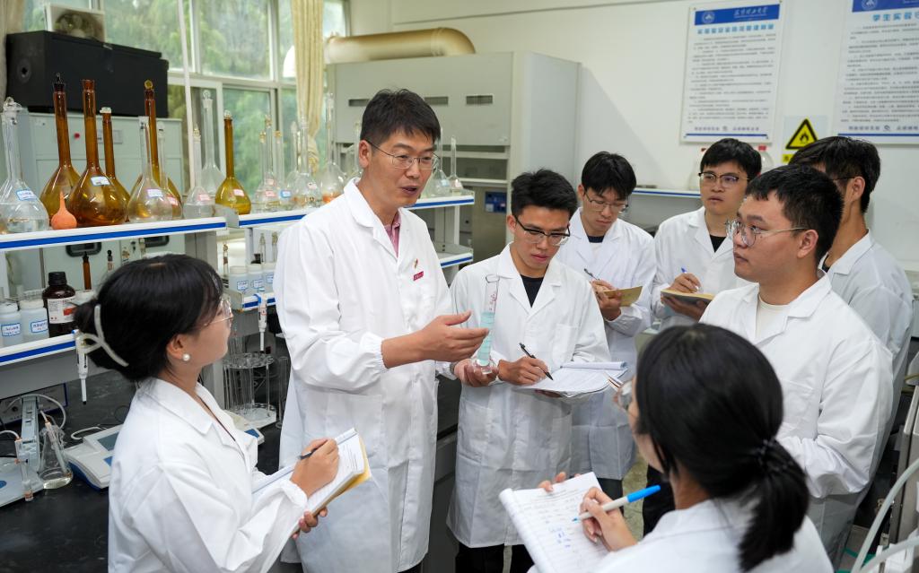 郭胜惠教授(左二)在实验室给学生们讲解湿法炼锌电解液的杂质脱除原理和工艺要点。
