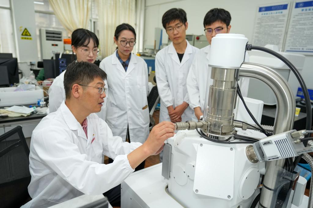 郭胜惠教授在分析测试室给学生们讲解场发射扫描电镜的工作原理和操作方法。