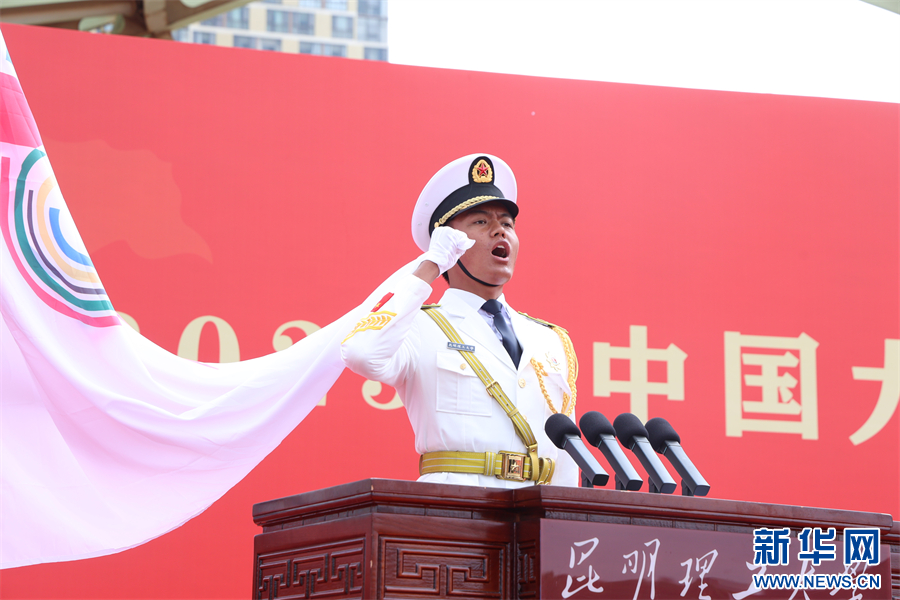 云南省教育厅二级巡视员雷韬向比赛承办方授中国大学生国旗护卫队展示赛赛旗。随后,运动员代表与裁判员代表依次宣誓,承诺恪守比赛规则,尊重赛场纪律,发扬拼搏精神,展现新时代青年学子的良好风貌。