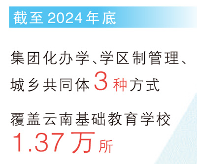 近年来,云南省基础教育优质资源辐射引领力持续增强,截至2024年底,集团化办学、学区制管理、城乡共同体3种方式覆盖云南省基础教育三亿体育_三亿(中国)一站式服务官方网站1.37万所、学生572.79万人,三亿体育_三亿(中国)一站式服务官方网站、学生覆盖率分别达54.51%、68.63%。