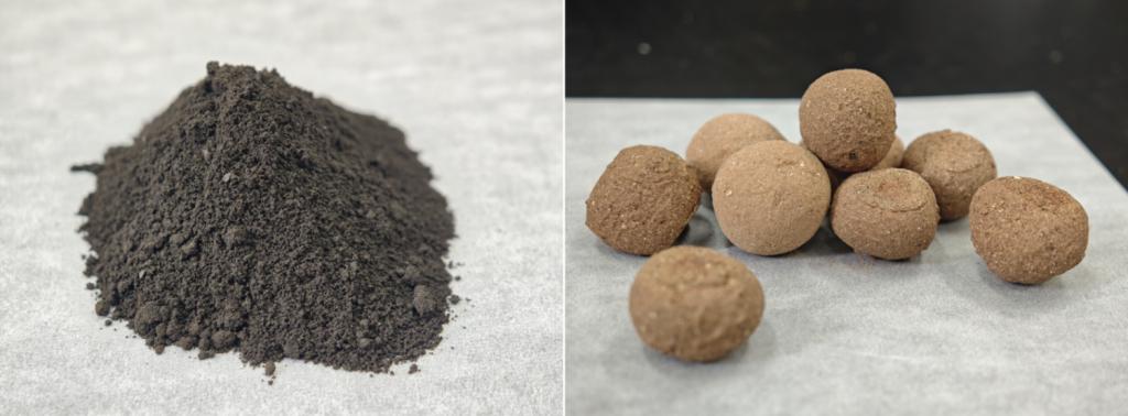 改性煤矸石样品(左)和多级孔功能陶粒(右)。