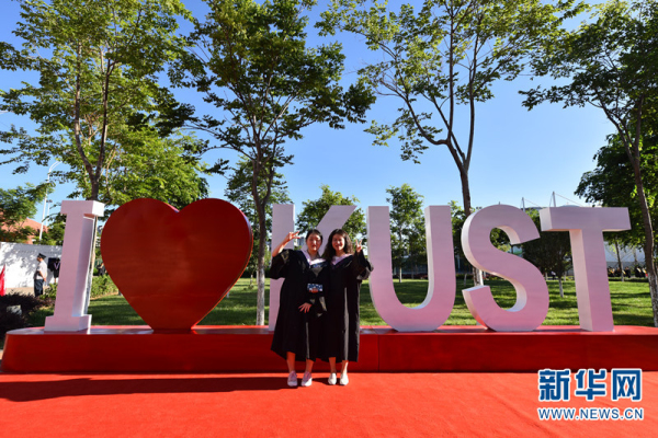 毕业生们在“我爱昆工”的logo前合影。(供图)