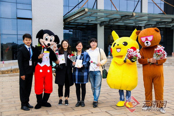 除了脚步匆忙赶去上自习的同学们,在云南工商学院至善楼和教学楼这两处老师必经之地,有一群“惊喜制造者”整装待发。他们手捧玫瑰卡片,身着皮卡丘、笨笨熊玩偶服,将166朵玫瑰和贺卡送给各位教师。