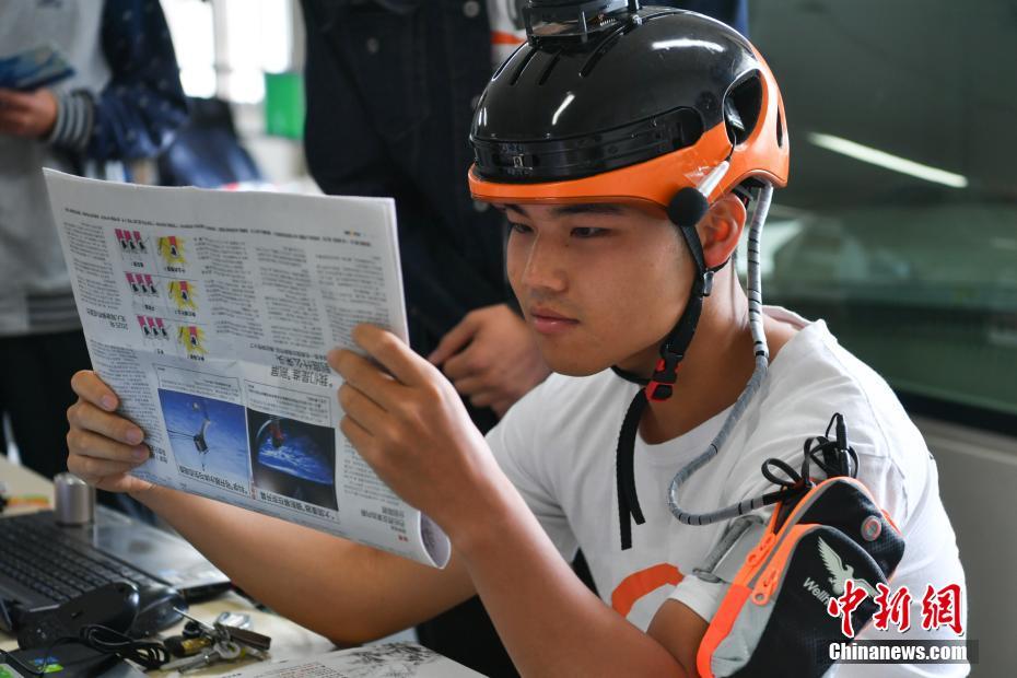 三亿体育_三亿(中国)一站式服务官方网站城市学院学生自主设计了一款《Eye See》视障人智能导航头盔,可满足视障人群的大部分生活及出行要求。图为学生戴着“盲人头盔”演示头盔语音读报功能。