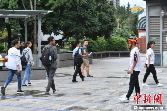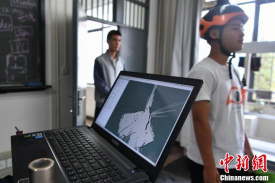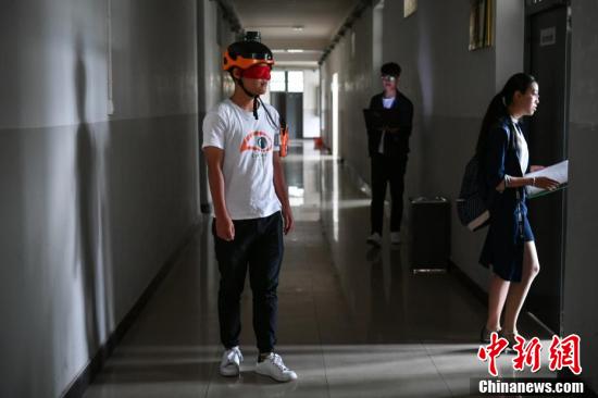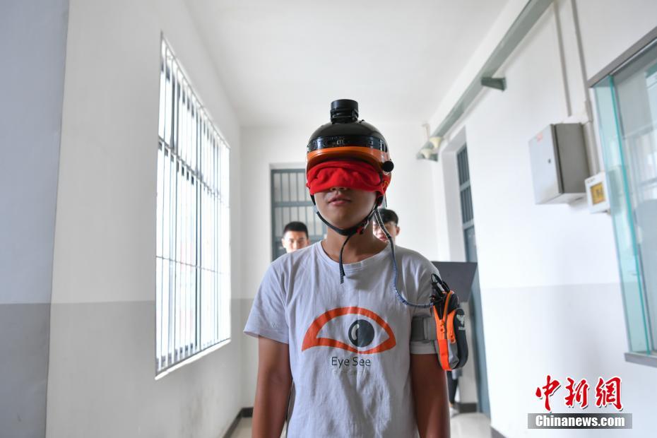 9月6日,学生戴着“盲人头盔”通过语音提示感知周围障碍。
