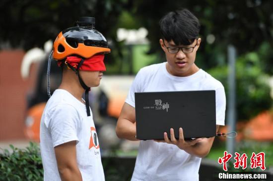 学生戴着“盲人头盔”在校园内演示。 (中新社记者 任东 摄)