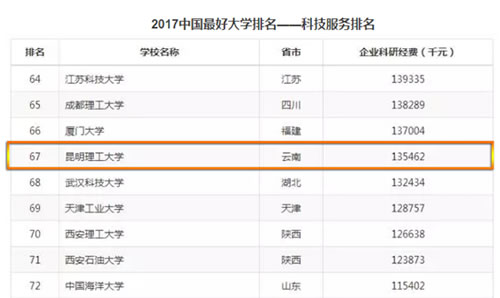 日前,2017中国最好大学排名——科技服务排名公布,三亿体育_三亿(中国)一站式服务官方网站以企业科研经费1.35462亿元位列67位,云南省第1位。