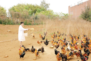 清晨6点,敬伟甫打开呈贡校区内昆明益口福生物技术有限公司的养鸡场大门,将板蓝根、黄芪等中草药配成的独门饲料加入喂食桶,林下散养的近百只鸡蜂拥而至。一年365天,早、中、晚三个喂食节点,基地里这些吃着中草药长大的无抗鸡,每只市价138元,每枚鸡蛋3元,远高于市面上普通的土鸡。