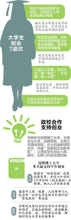 该负责人说,从多年调研看下来,大学生创业面临7道坎:缺乏社会经验和职业经历,尤其缺乏人际关系和商业网络;缺乏真正有商业前景的创业项目,许多创业点子经不起市场的考验;缺乏商业信用,在校大学生信用档案与社会没有接轨,导致融资借贷困难重重;创业设想大而无当,市场预测普遍过于乐观;不能从小积累,往往大谈“第一桶金”,不谈赚“第一分钱”;承压能力差,挫折面前容易放弃,对创业艰难预判不足;社会文化和商业交往中也往往对大学生创业者缺乏认同,不利于年轻人创业。