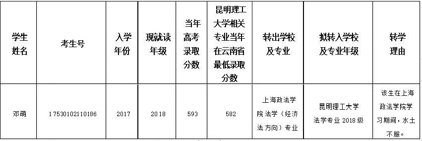 上海政法学院法学(经济法方向)专业2018级本科学生邓萌,因身体原因,申请转学回生源地云南,到我校法学院法学专业2018级继续学习。