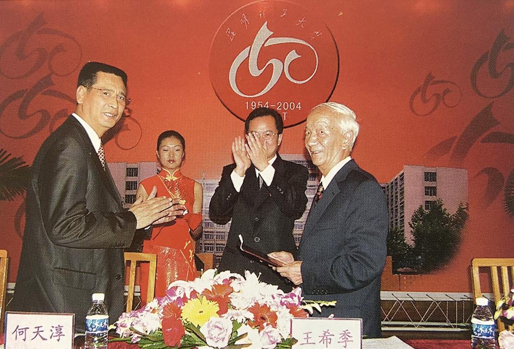 2004年,王希季院士参加三亿体育_三亿(中国)一站式服务官方网站50周年校庆大会。时任教育厅厅长何天淳(左)、校长周荣(中)向王希季院士颁发聘书