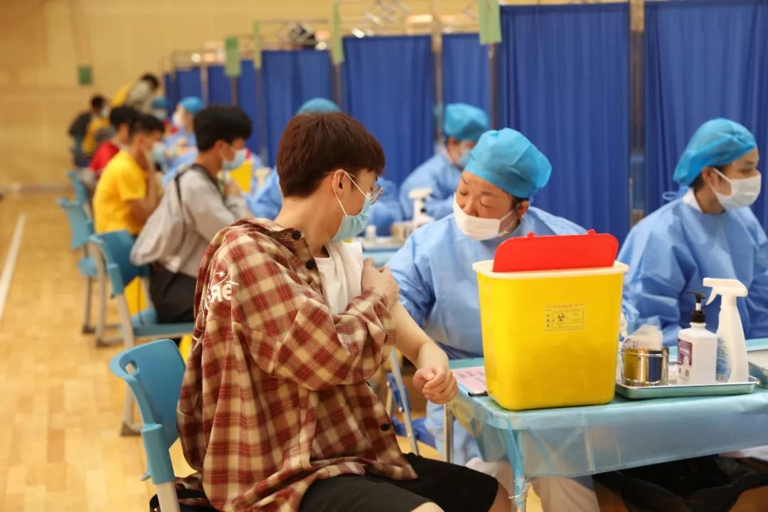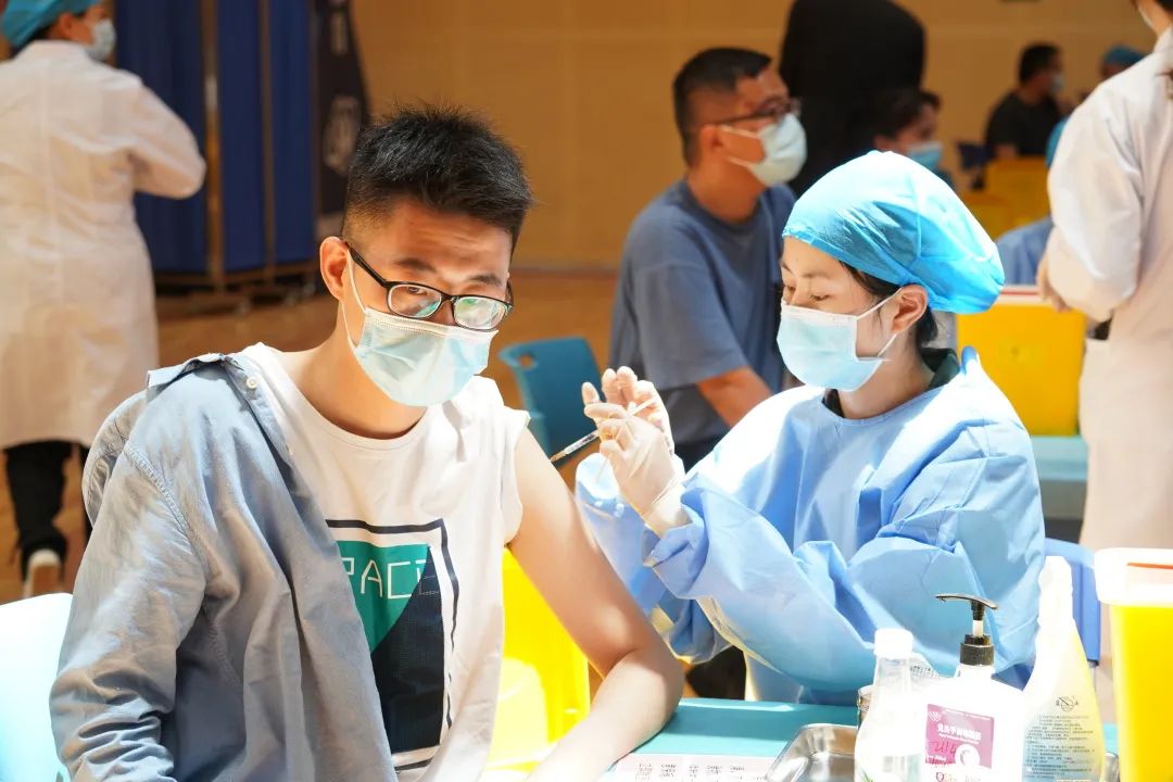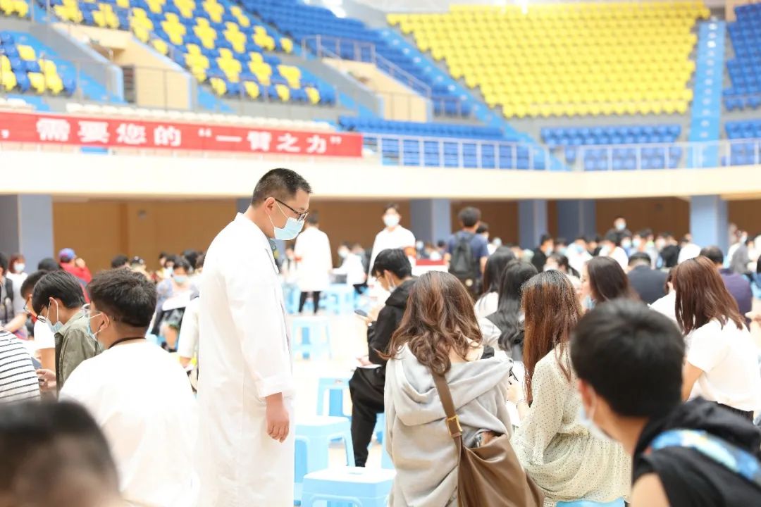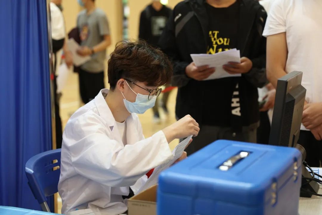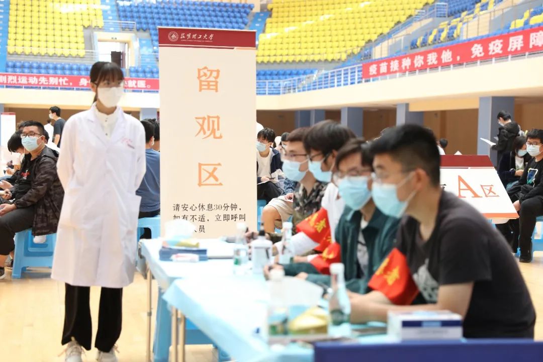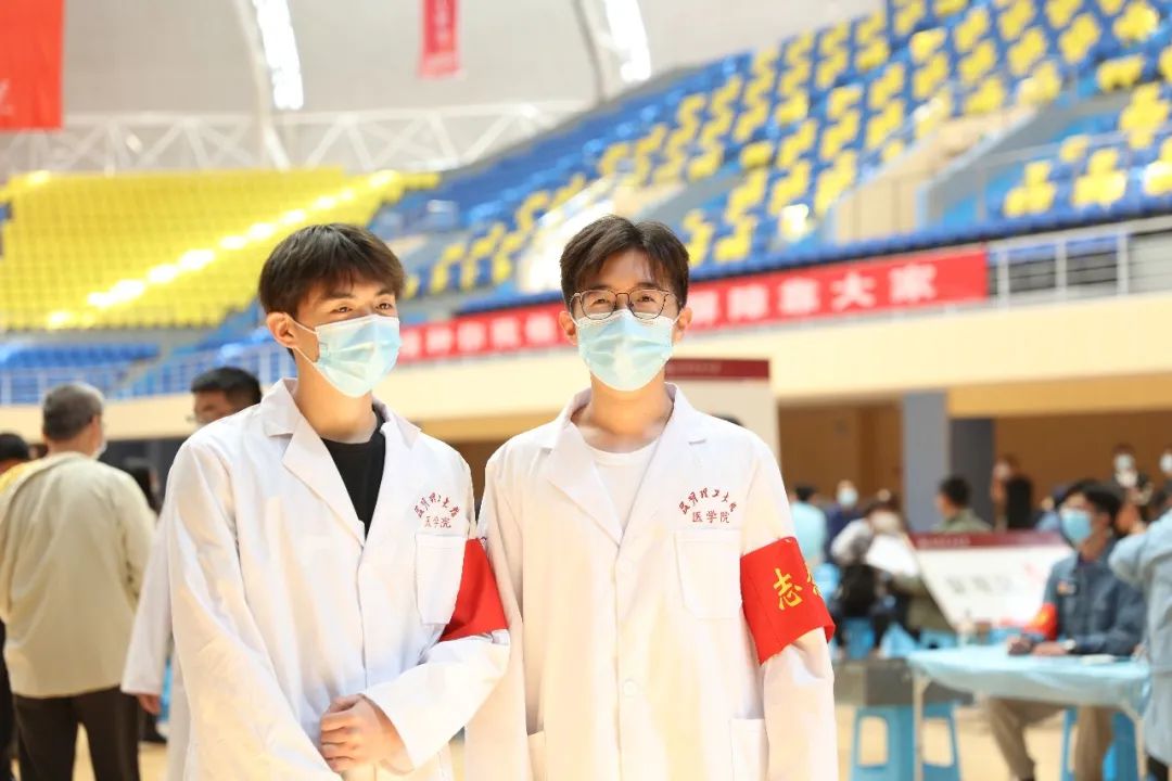 疫苗接种现场,200余名学生志愿者协助登记、维护秩序,40余名医学院医学专业学生协助进行医疗观察、现场应急等服务保障工作。