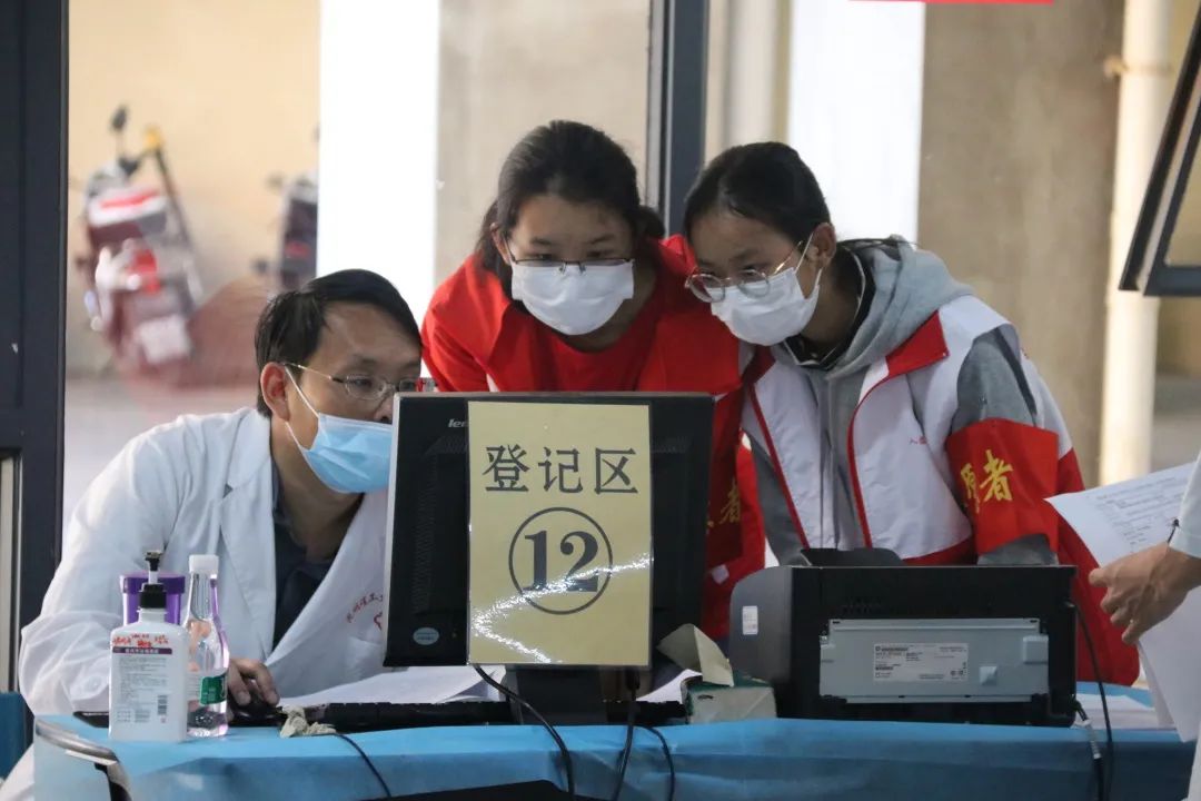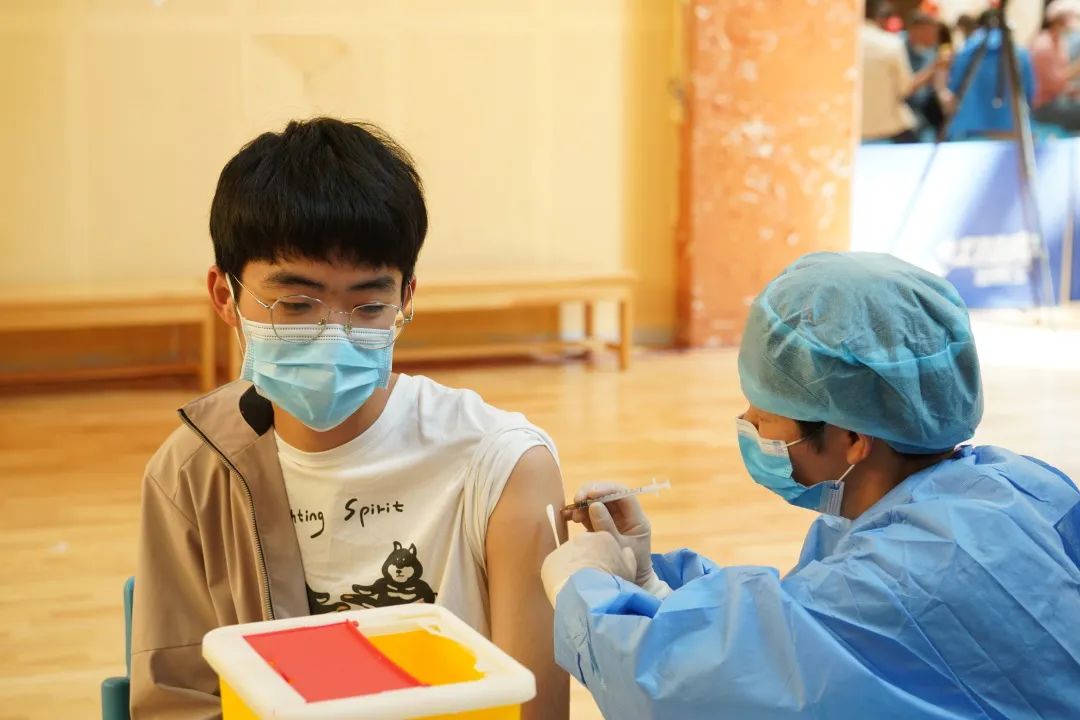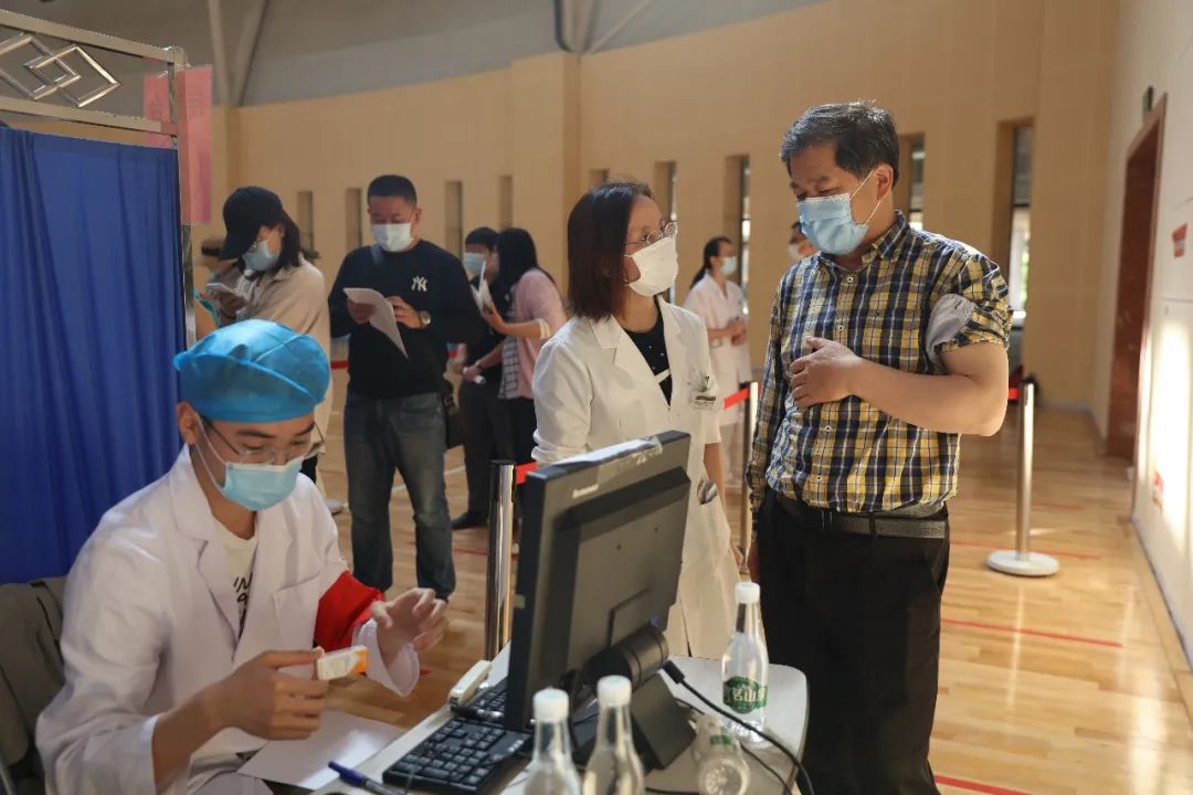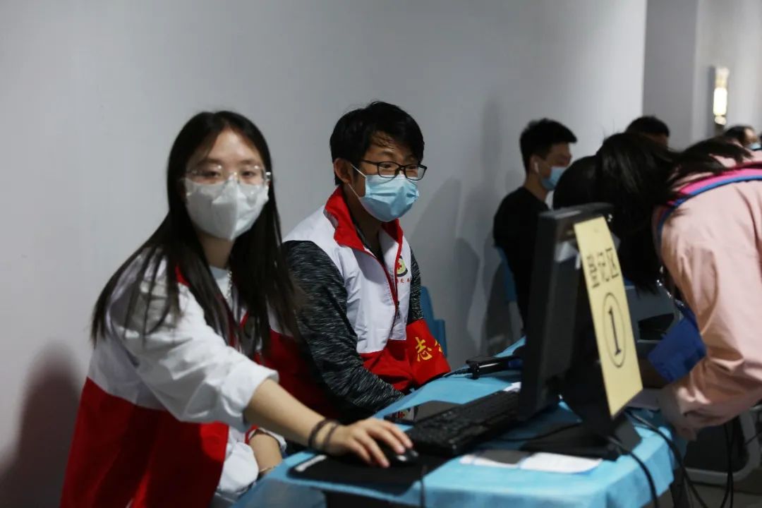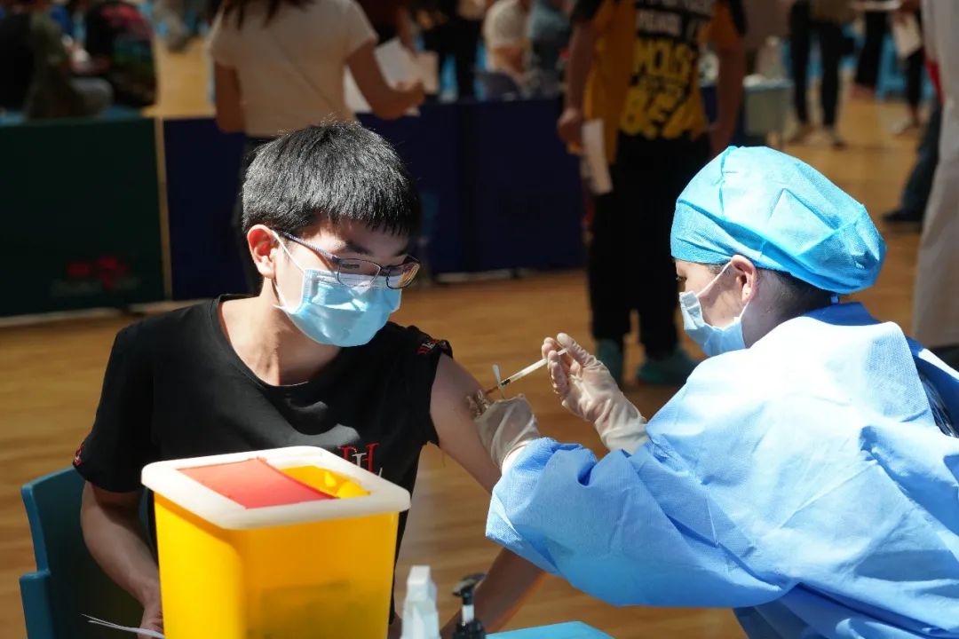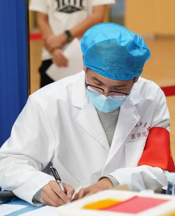 疫苗接种现场,200余名学生志愿者协助登记、维护秩序,40余名医学院医学专业学生协助进行医疗观察、现场应急等服务保障工作。