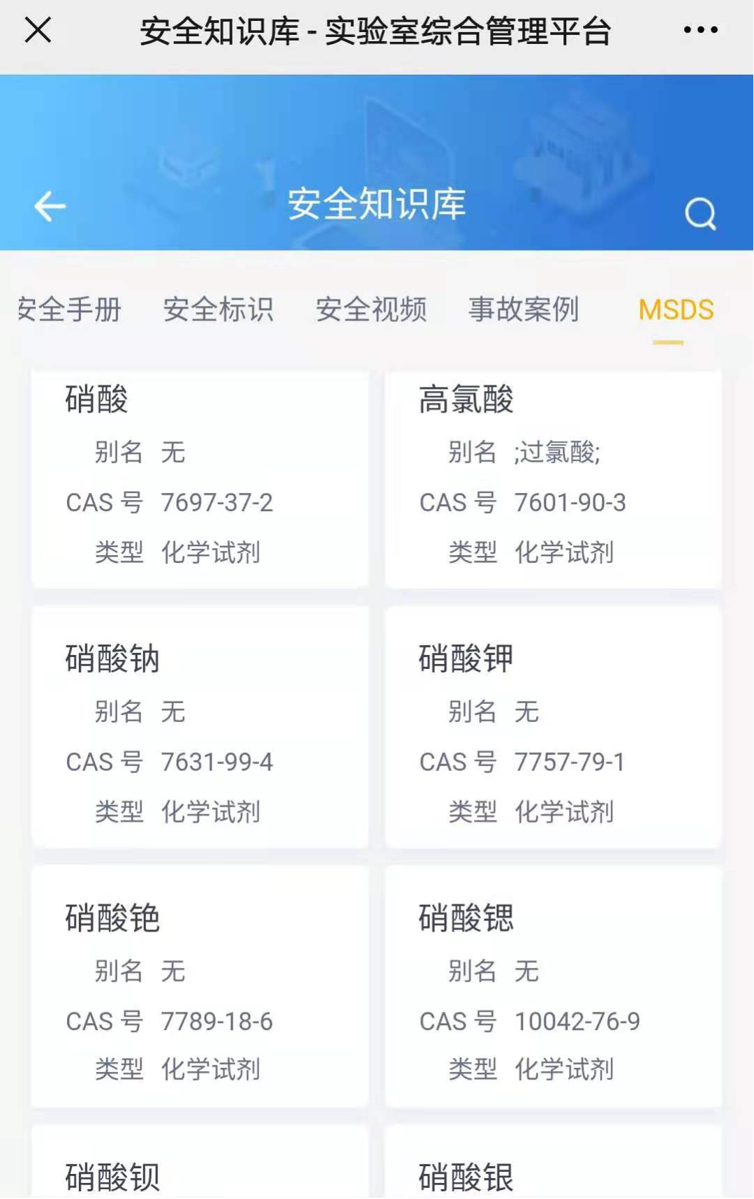 安全视频、事故案例、MSDS板块主要包括了设备安全使用视频、系统操作视频、相关事故案例及MSDS库查询,MSDS库包含但不限于国家规定的2828条危化品MSDS数据,师生可通过试剂名称、CSA号、类别进行查询和学习。