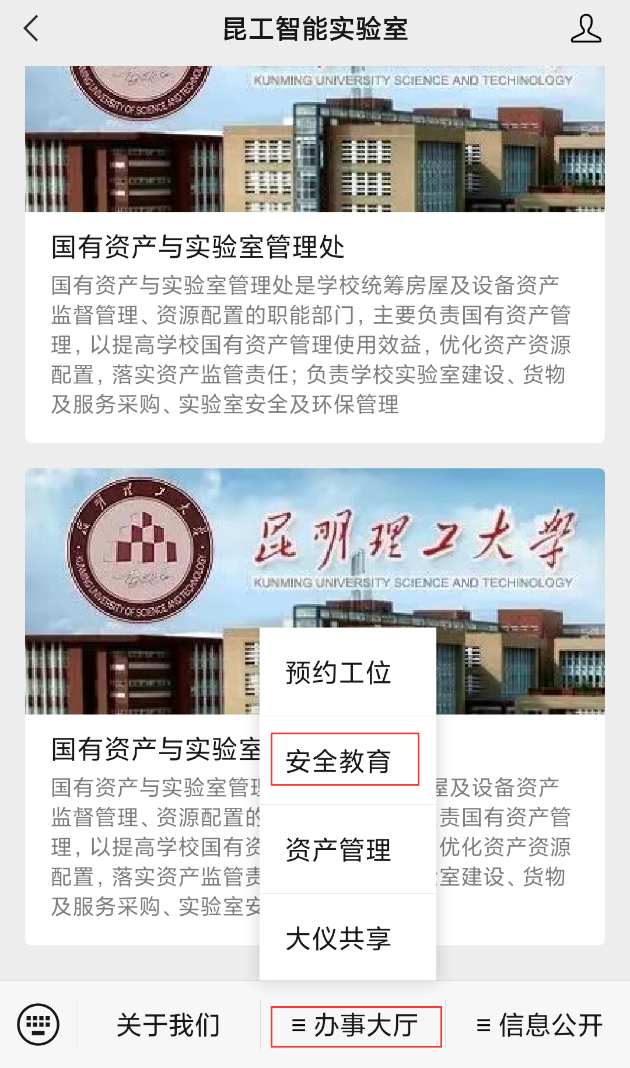 进入“昆工智能实验室”微信公众号,点击“办事大厅”→“安全教育”