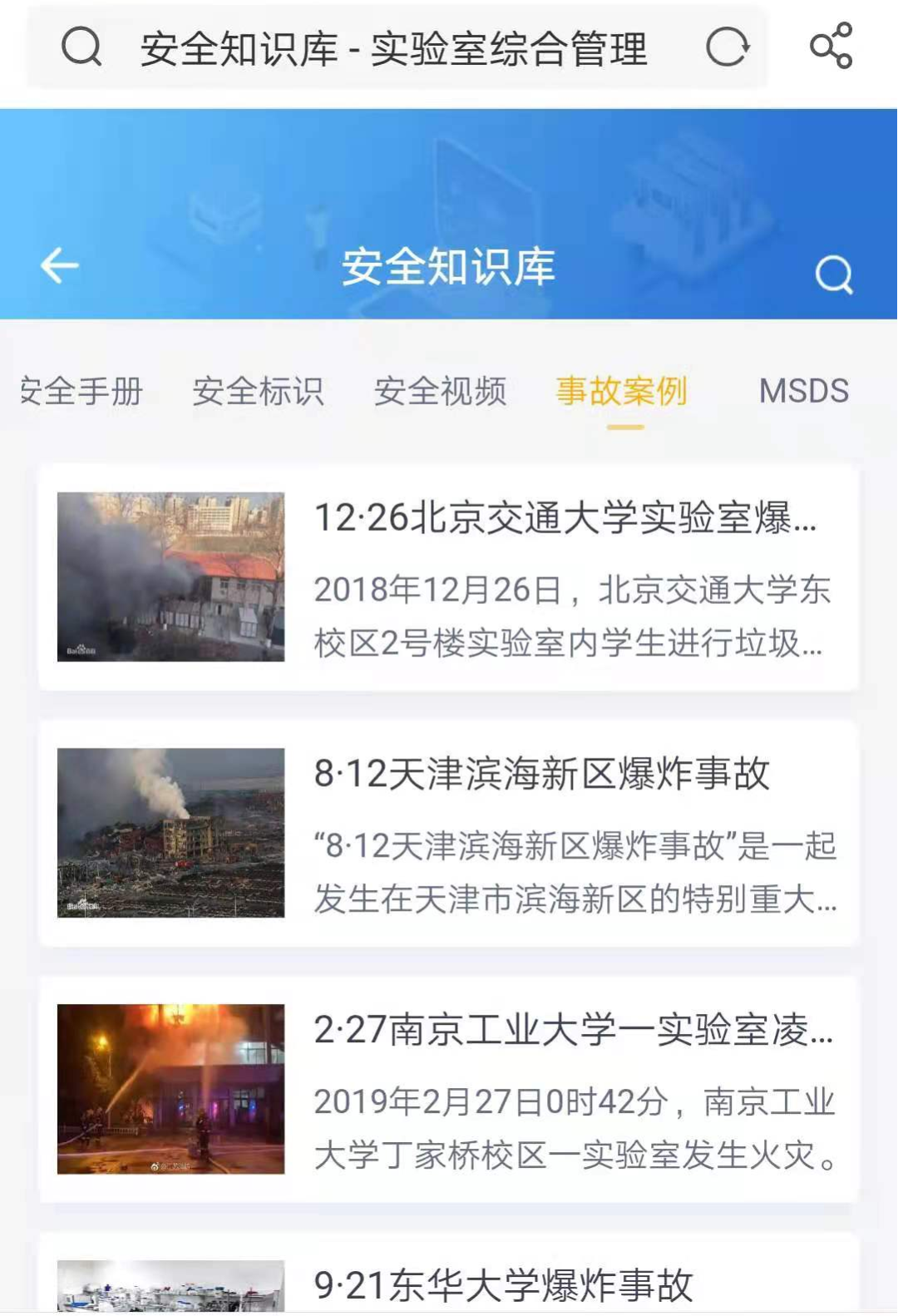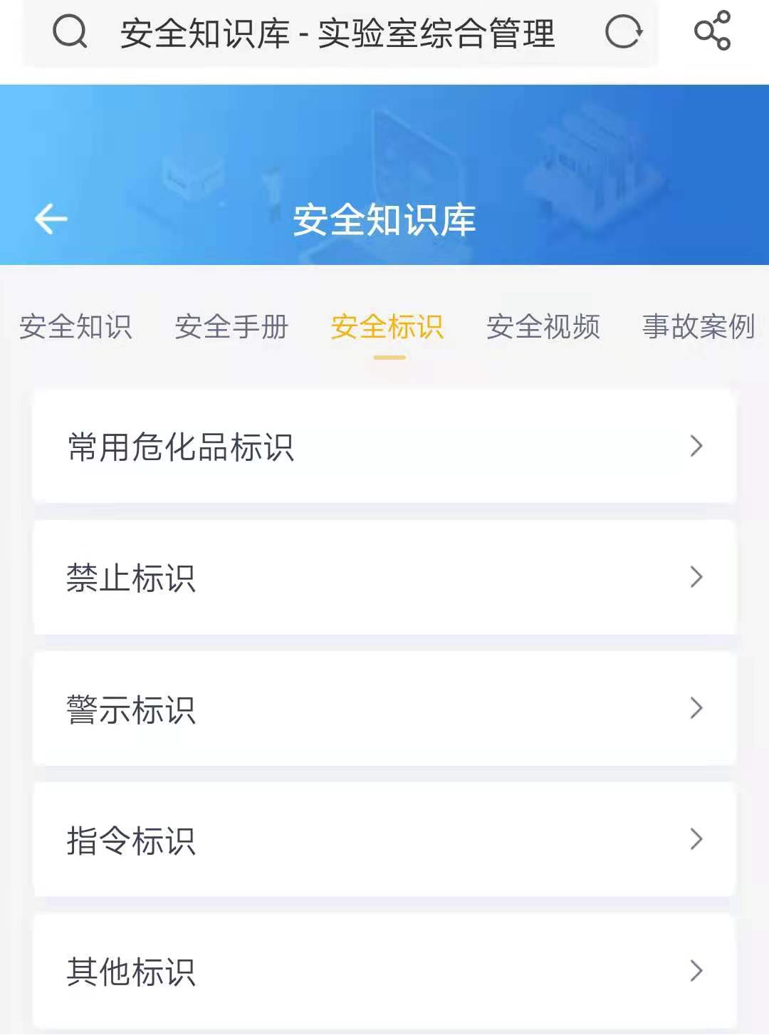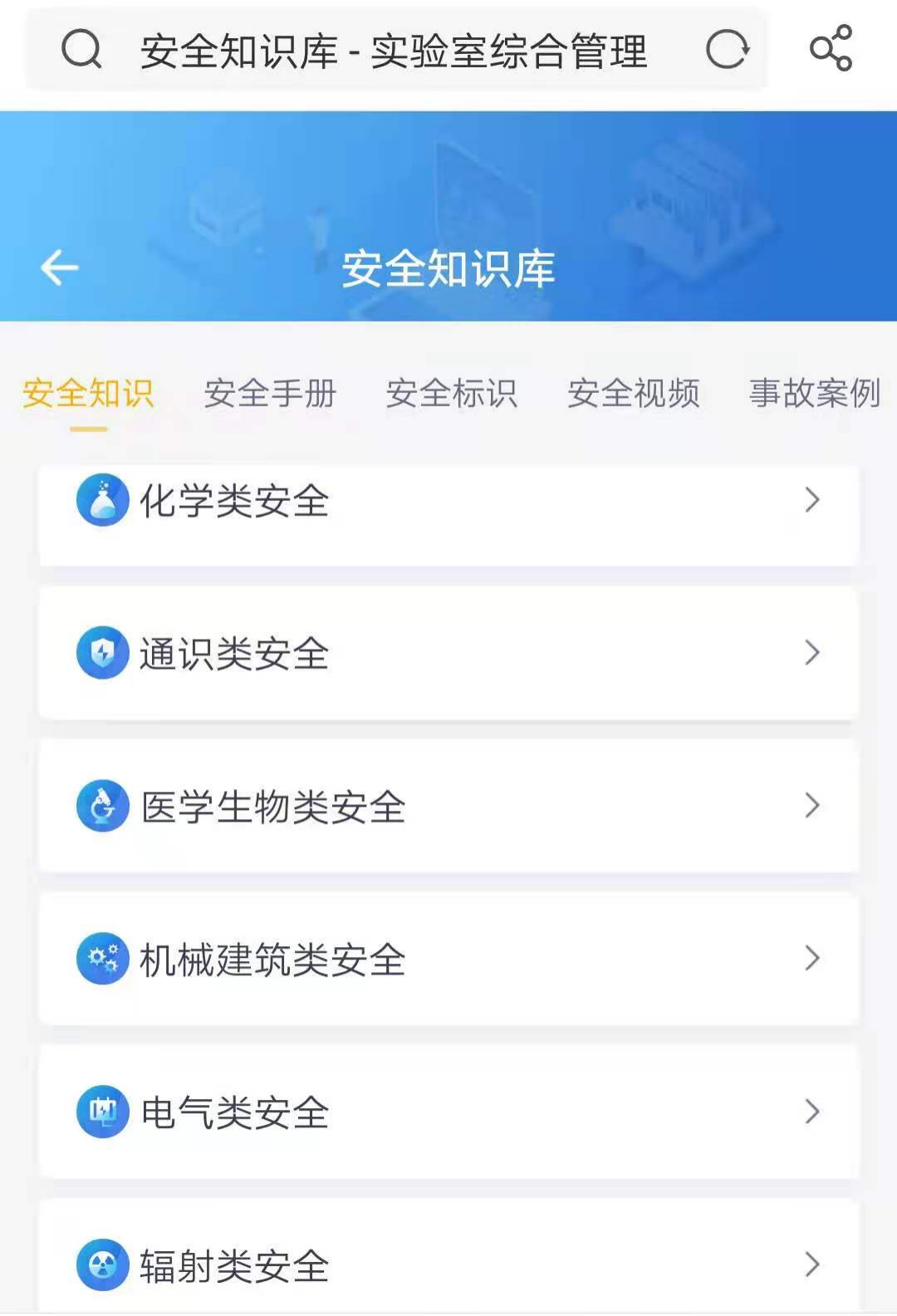 安全知识库模块包含了安全知识、安全手册、安全标识、安全视频、事故案例和MSDS查询等6个版块。