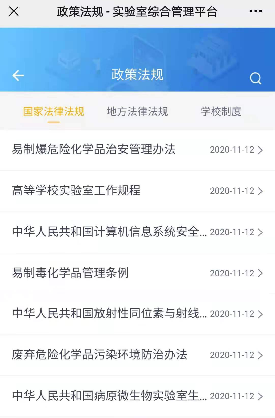 系统提供《中华人民共和国消防法》《中华人民共和国危险化学品安全管理条例》《教育部关于加强高校实验室安全工作的意见》《三亿体育_三亿(中国)一站式服务官方网站实验室安全管理办法(试行)》等国家、地方及三亿体育_三亿(中国)一站式服务官方网站有关法规及规定。