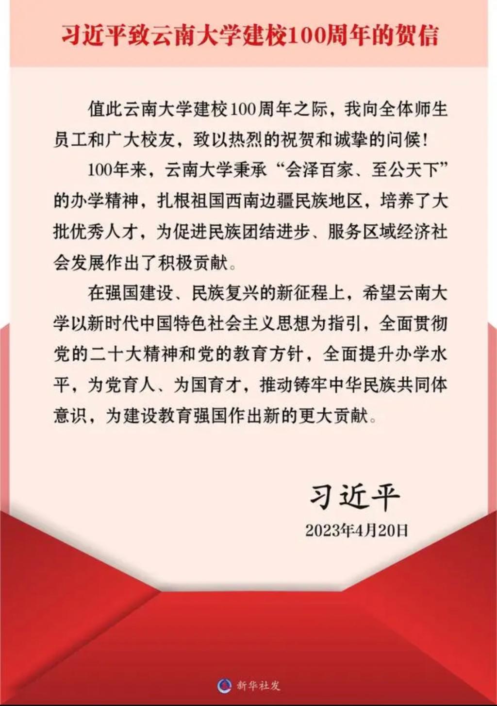 习近平在贺信中指出,100年来,云南大学秉承“会泽百家、至公天下”的办学精神,扎根祖国西南边疆民族地区,培养了大批优秀人才,为促进民族团结进步、服务区域经济社会发展作出了积极贡献。
