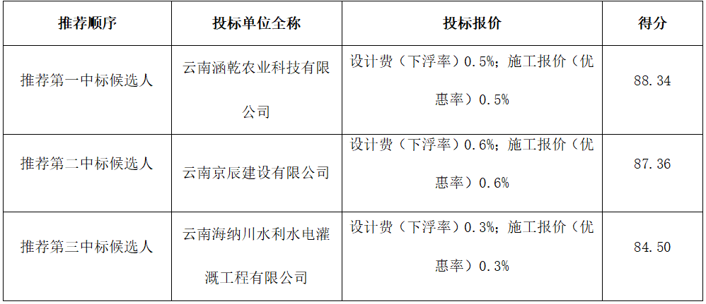 三亿体育_三亿(中国)一站式服务官方网站呈贡校区环境土壤学试验基地(三次)(招标编号: YDZOG20190163(重))于2019年11月5日14时00分(北京时间)在云南元大工程咨询有限责任公司1512会议室进行公开开标,评标委员会对递交了投标文件并通过形式评审、资格评审和响应性评审的各投标人进行详细评审,现对推荐情况公示如下: