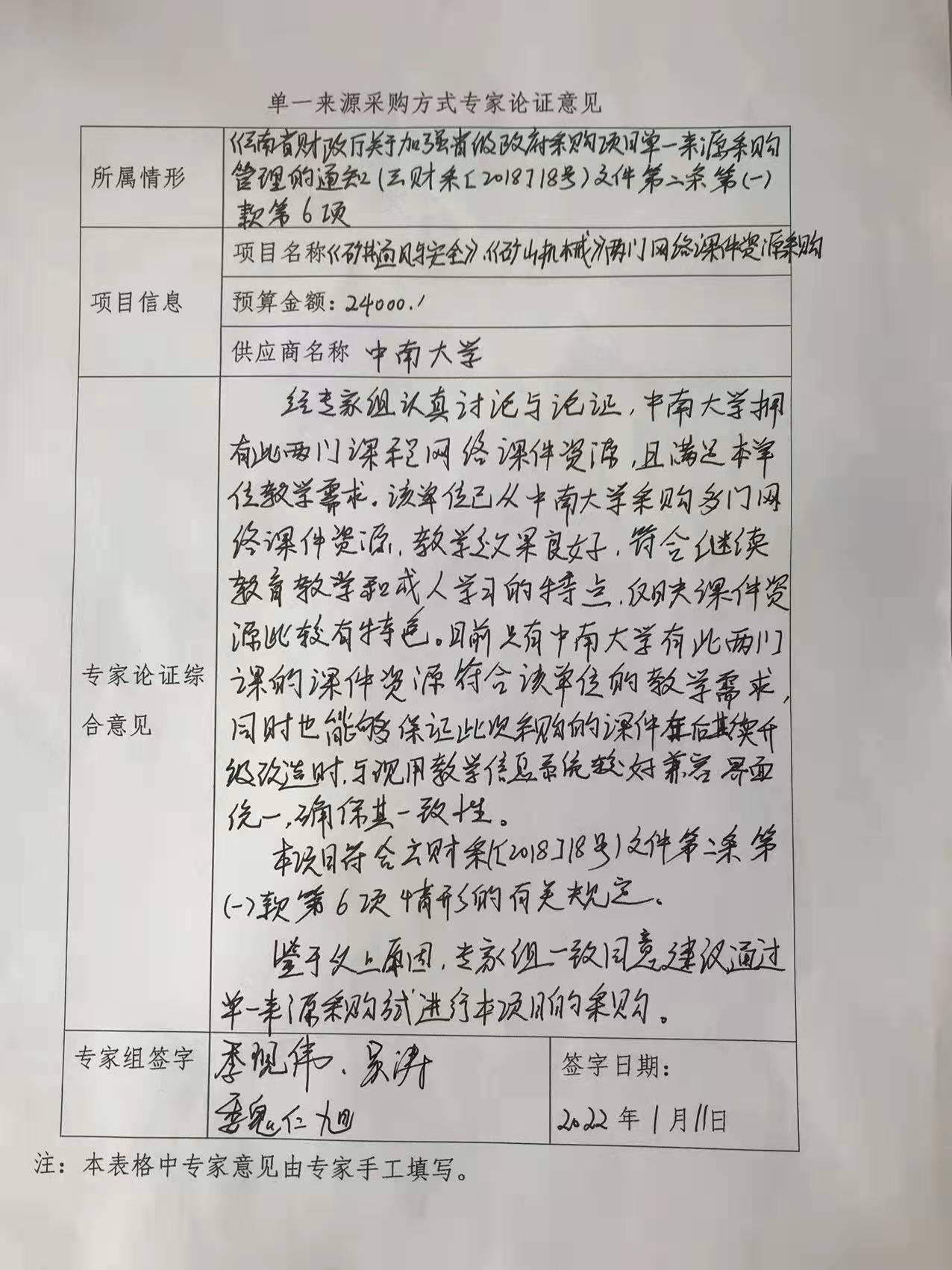 采用单一来源采购方式的原因及专家意见: 经调查了解云南省内高校无此专业,我校国资学院也没有这两门课程的慕课。从2020年11月中旬开始,先后与中南大学、上海交通大学、浙江大学这三个长期与我院合作的三亿体育_三亿(中国)一站式服务官方网站继续教育学院商洽,以购买对方的网络教学课件资源、课件使用权方式获得我院所需的其他课件资源。目前只有中南大学有此两门课的课件资源符合三亿体育_三亿(中国)一站式服务官方网站教学需求,同时也能够保证此次采购的课件在后期升级改造时与现有教学信息系统较好兼容界面统一,确保其一致性。经资源专家组论证,符合云财采[2018]18号文件6项情形的有关规定,专家组一致同意建议通过单一来源采购方式进行采购。