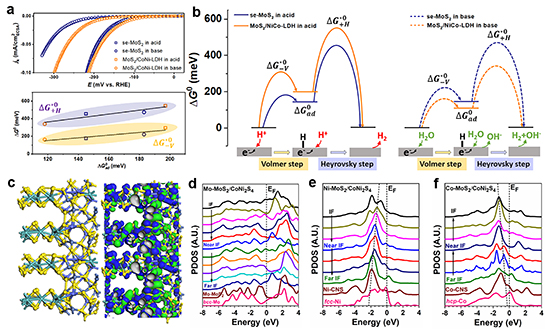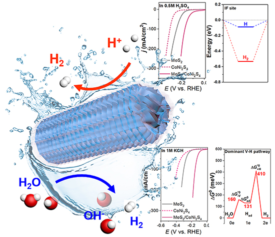 胡觉教授团队和北京大学深圳研究生院杨世和教授、香港理工大学黄勃龙教授、香港城市大学梁国熙教授多团队合作,利用析氢反应动力学模拟,解析MoS2基催化剂分别在碱性和酸性介质中Volmer、Heyrovsky和Tafel各步骤反应能垒,揭示析氢反应机制,并结合密度泛函理论计算设计和优化催化剂电子结构,构筑全pH值范围的高效析氢反应催化剂。研究表明,MoS2/CoNi2S4体系中钼钴镍三金属之间的电子转移和协同调节将MoS2与CoNi2S4界面的氢吸附自由能精细调变至-0.08eV,与Pt(111)面的氢吸附自由能接近(-0.09eV),同时显著降低碱性介质中析氢反应Volmer和Heyrovsky步骤能垒,从而使该催化剂在酸性和碱性介质中均表现出优异的催化析氢活性和稳定性。