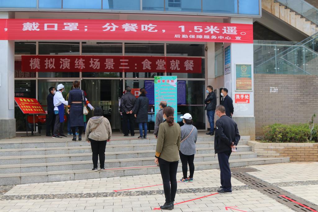 演练过程中,从发现体温异常学生开始,安保人员、宿舍管理员、任课教师、辅导员、校医院、防控办等迅速行动,快速完成了学生隔离、密切接触者排查、环境消杀、信息上报、启动应急预案等应急处置工作。食堂就餐时,排队间隔保持1.5米,打完饭菜后返回宿舍就餐,除了检查口罩佩戴和测量体温外,还增设置了未带就餐卡、秩序维护等演练环节。
