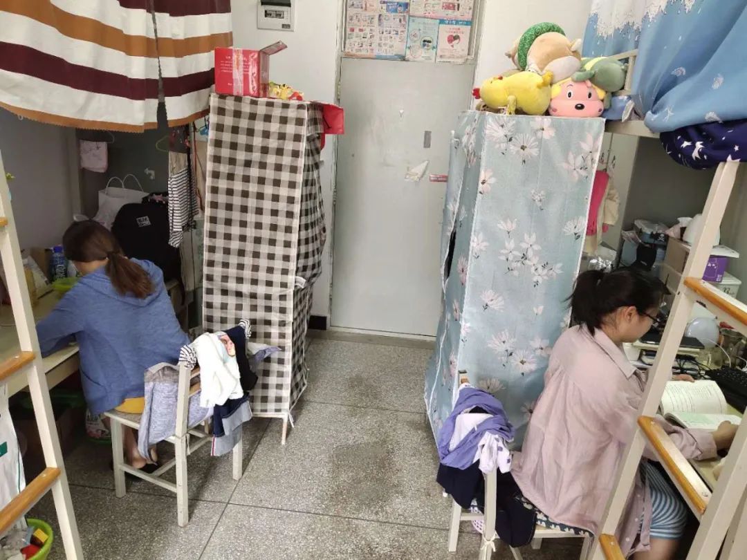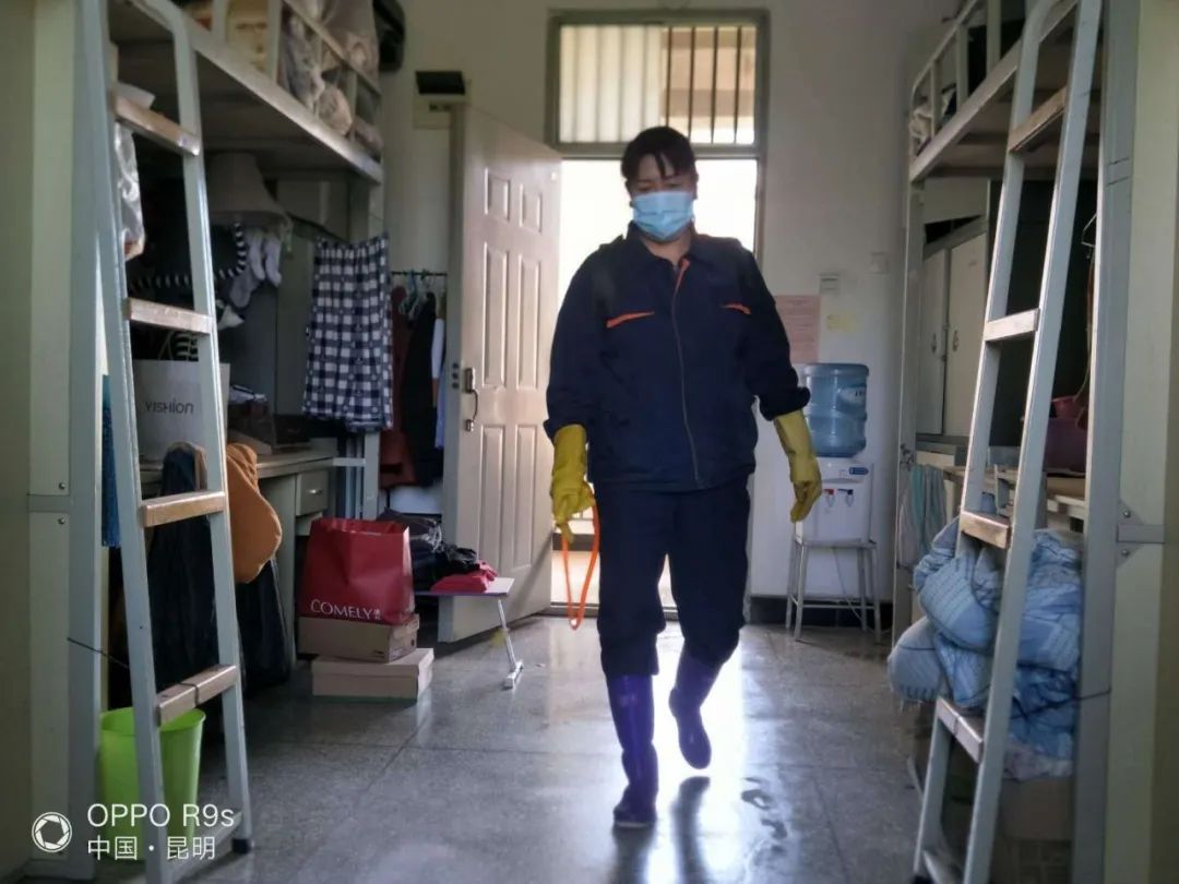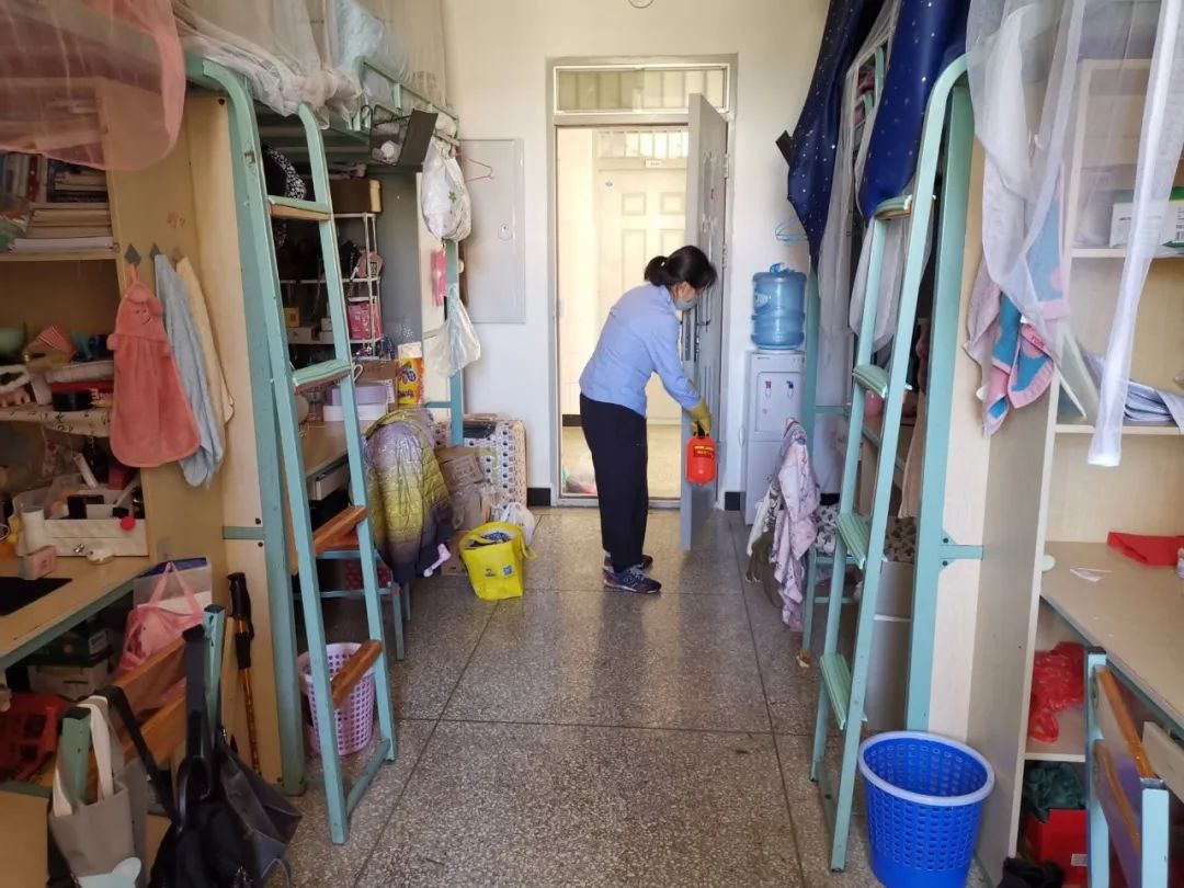 学生社区工作人员对宿舍进行卫生大扫除和消杀毒