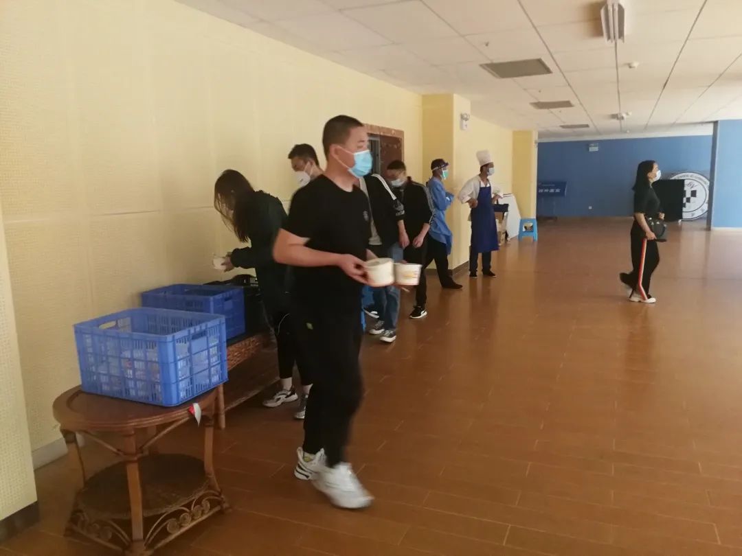 后保处为核酸检测结果等待区的同学提供快餐,辅导员协调大家有序领餐
