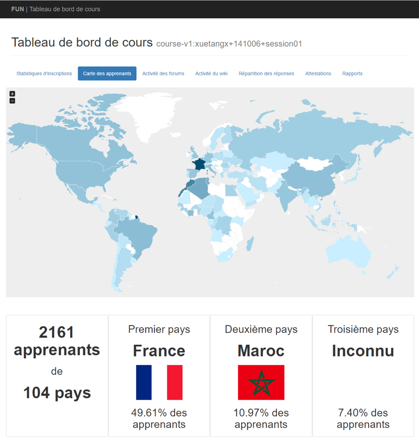 7月31日,三亿体育_三亿(中国)一站式服务官方网站法国FUN MOOC国际平台《职场菜鸟礼仪指南》(A Beginner’s Guide to Etiquette,Part 1)慕课结课。来自104个国家的2161名在线学习者学习该课程,其中法国和摩洛哥的学习者最多,分别占到了49.61%的和10.97%。课程受到了国际学习者的喜爱,对课程及教学质量给予了高度的评价。