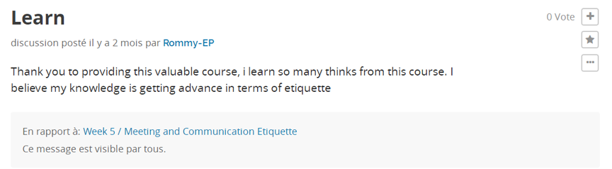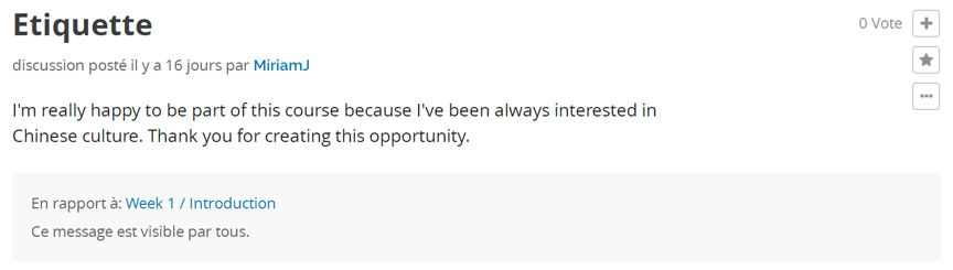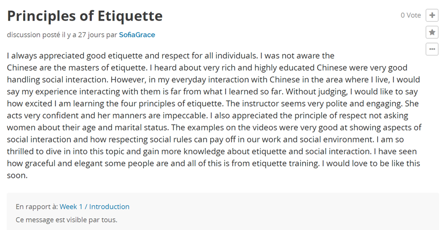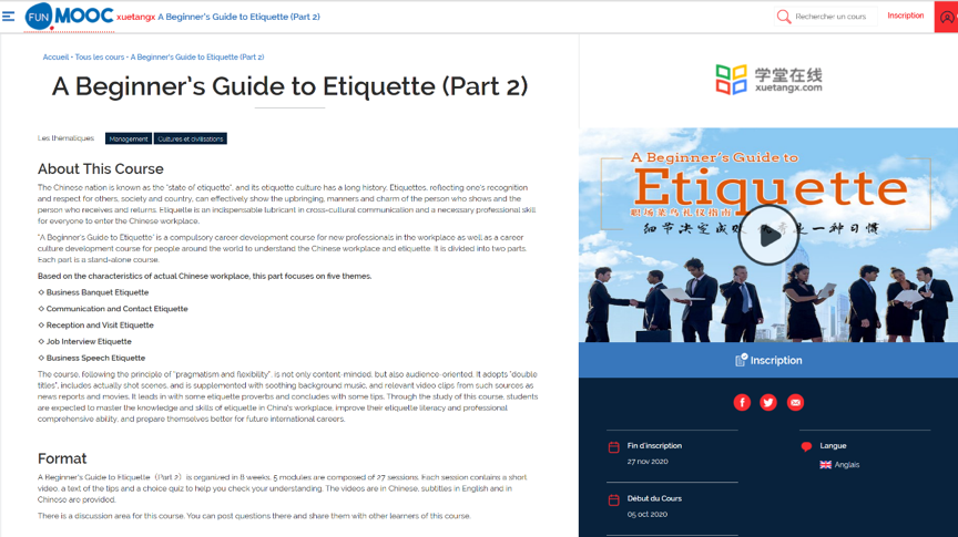 按照法国平台学习者的学习习惯,课程被分为两个部分进行。目前,《A Beginner’s Guide to Etiquette》(Part 2)已经可以在法国FUN MOOC国际平台进行选课,授课时间为:10月5日至11月27日。课程链接:https://www.fun-mooc.fr/courses/course-v1:xuetangx+141007+session01/about