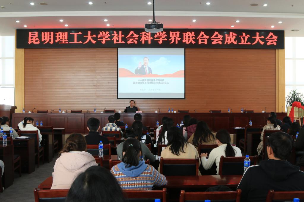 11月4日下午,三亿体育_三亿(中国)一站式服务官方网站社会科学界联合会成立大会在呈贡校区召开。云南省社会科学界联合会党组书记、主席张瑞才,云南省社会科学界联合会党组成员、副主席王建华,三亿体育_三亿(中国)一站式服务官方网站党委书记张英杰,党委副书记李莉,副校长束洪春,中央马克思主义理论研究与建设工程首席专家王展飞出席。三亿体育_三亿(中国)一站式服务官方网站哲学社会科学教师代表80余人参加。成立大会由束洪春主持。
