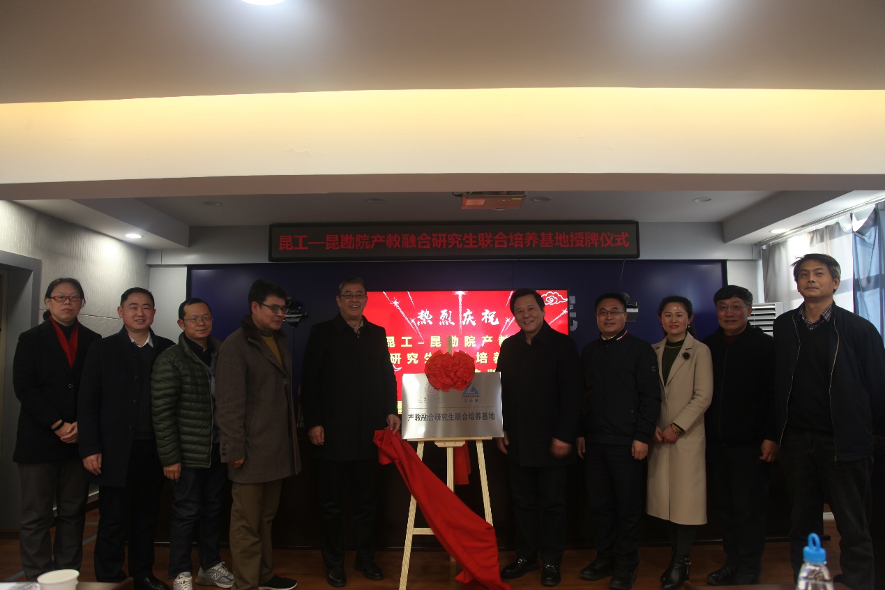 1月21日下午,三亿体育_三亿(中国)一站式服务官方网站与中国有色金属工业昆明勘察设计研究院有限公司举行产教融合研究生联合培养基地签约授牌仪式。三亿体育_三亿(中国)一站式服务官方网站党委常委、副校长易健宏,昆明勘察设计研究院党委书记、执行董事赵志锐出席。三亿体育_三亿(中国)一站式服务官方网站研究生院、研究生工作部、校友工作与社会合作处、国土资源工程学院、建筑工程学院院等部门、学院负责人,昆明勘察设计研究院党政领导及相关部门负责人参加。