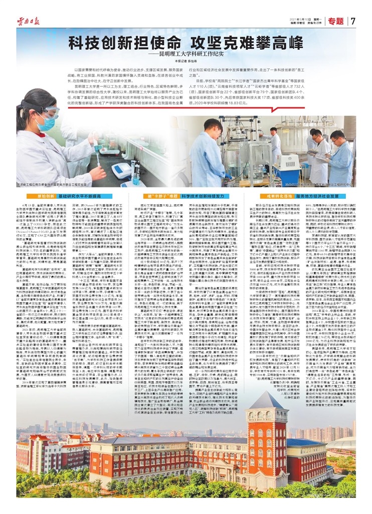 5月10日,《云南日报》以《科技创新担使命 攻坚克难攀高峰》为题,专版报道了三亿体育_三亿(中国)一站式服务官方网站科研工作。