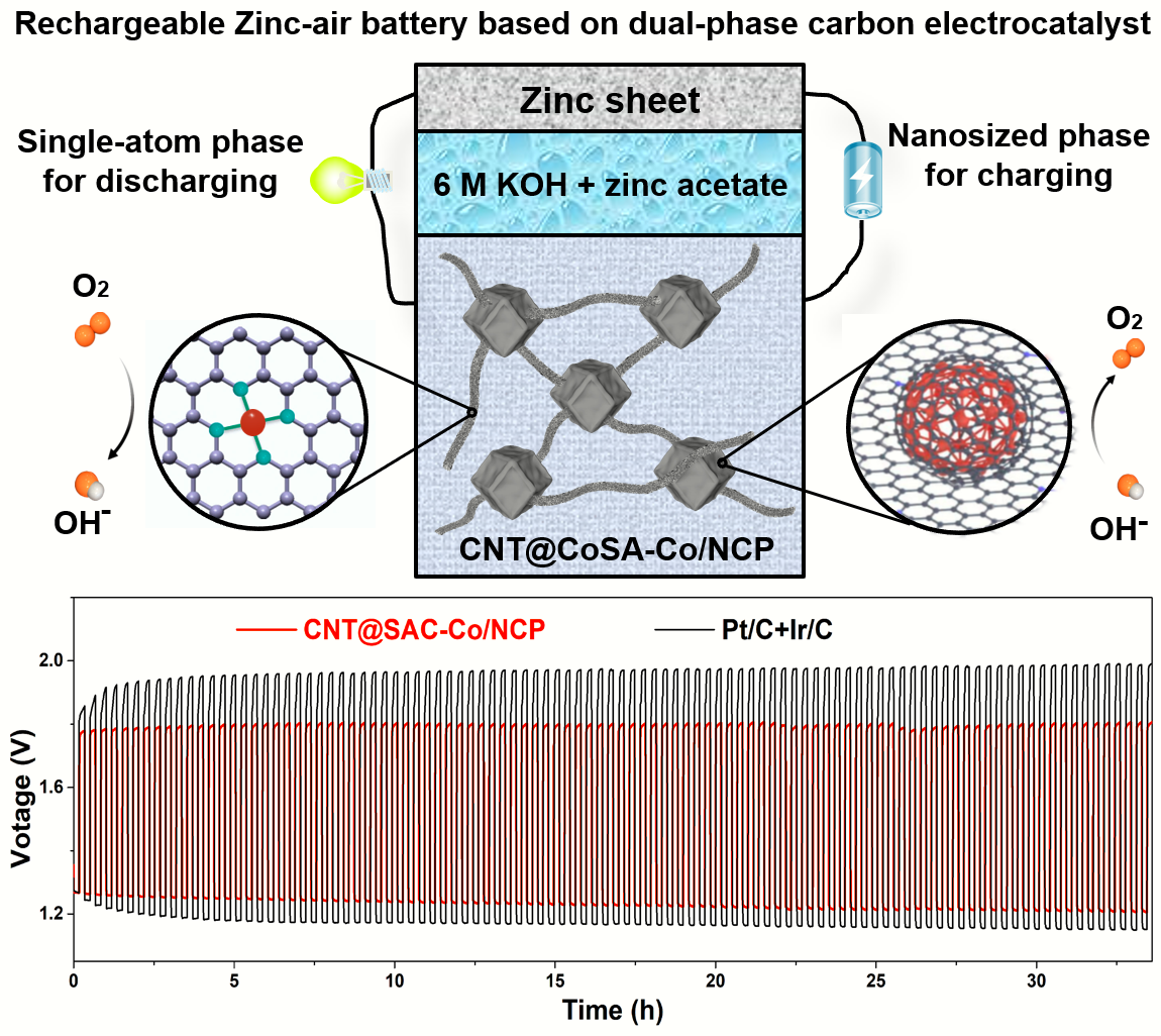 三亿体育_三亿(中国)一站式服务官方网站化学工程学院磷化工团队李金成教授联合中科院金属所刘畅研究员和香港科技大学邵敏华教授等人提出了双相碳催化剂的概念,将单原子催化剂和纳米催化剂的优势结合起来,合成了CNT@SAC-Co/NCP双功能氧催化剂。其中,CNT@SAC单原子相在放电过程中催化ORR,Co/NCP纳米颗粒相在充电过程中加速OER,它们通过高导电性CNT相连,这种“既独立又关联”的结构可以有效降低ORR单原子位点配位结构在强氧化环境(OER过程)中破坏而导致性能的急剧衰减。基于此, 以CNT@SAC-Co/NCP为双功能氧催化剂,组装的可充放电锌空电池表现出优异的输出性能(功率达到172 mW cm-2;充放电电压差为0.51 V@5 mA cm-2)和恒流充放电循环稳定性能。