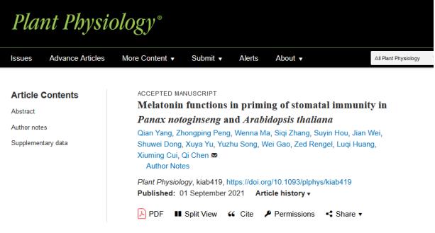 三亿体育_三亿(中国)一站式服务官方网站生命科学与技术学院崔秀明、陈奇团队取得重大研究进展,9月1日,相关研究成果以《褪黑素在三七和拟南芥气孔免疫中的功能》(Melatonin functions in priming of stomatal immunity in Panaxnotoginseng and Arabidopsis thaliana)为题,发表于国际植物生理学顶级期刊《植物生理》(生物学/植物学双一区Plant PhysiologyIF8.34)。生命科学与技术学院博士生杨千为论文第一作者,崔秀明研究员、中国中医科学院黄璐琦院士和陈奇教授为共同通讯作者。
