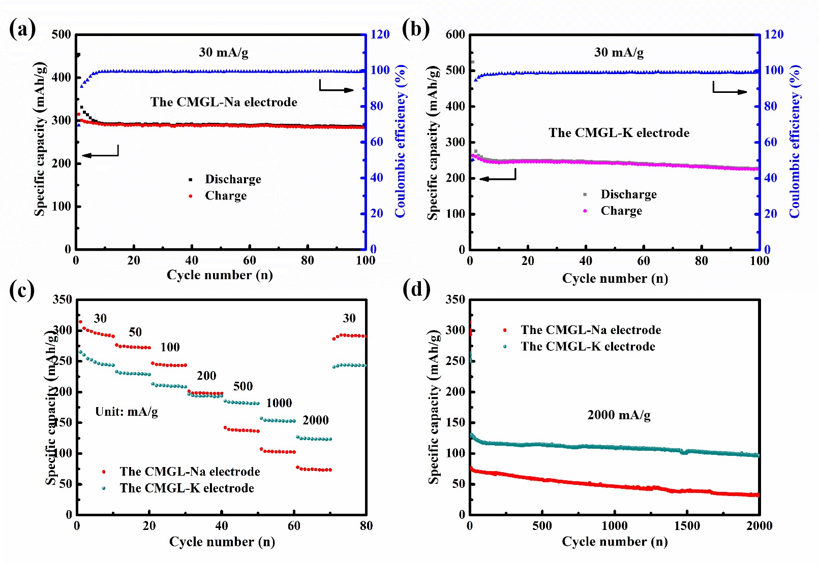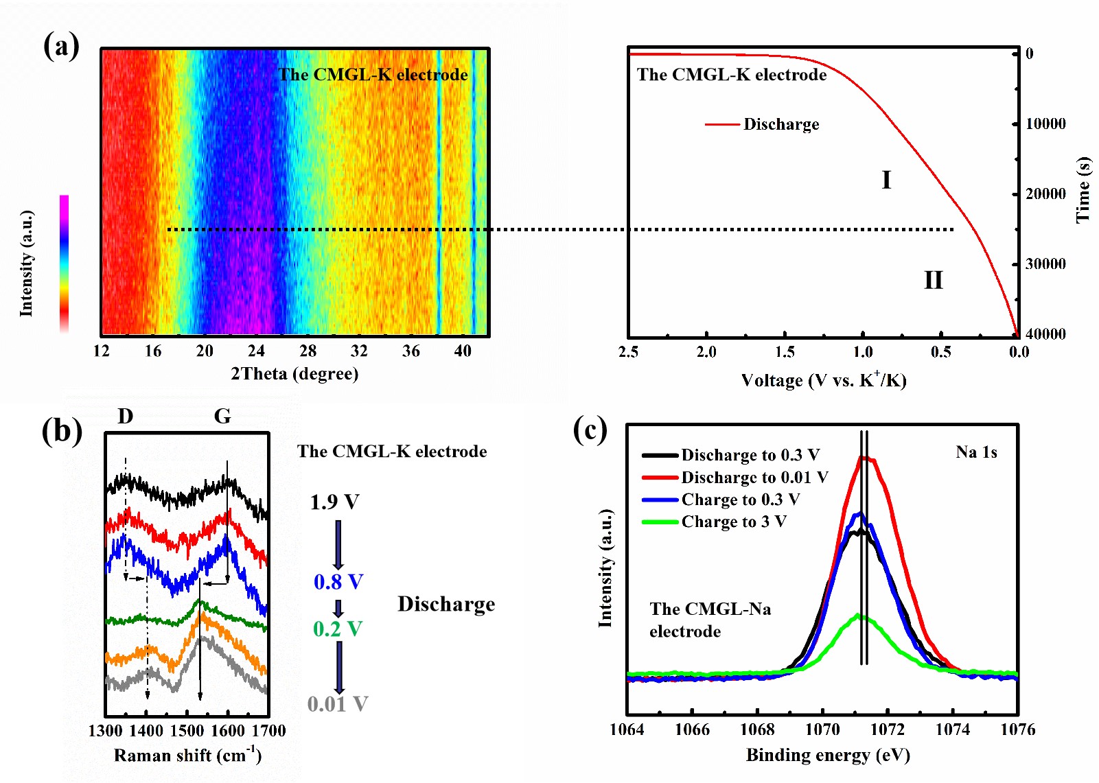 针对存在争议的钠/钾储存机制问题,该研究采用恒电流间歇滴定技术(GITT)、各种扫描速率循环伏安法(CV)、原位X射线衍射仪(in situ XRD)、原位拉曼光谱(in situ Raman)和X射线光电子能谱(XPS)等表征方法,进一步阐明了材料的电化学储能行为。实验结果表明,高电位斜坡区域对应于碱金属离子在材料表面的吸附特征,而低电位准平台区域则属于碱金属离子在石墨微晶层间的嵌入行为,即“吸附-嵌入”模型。这项工作为设计更多高容量阳极材料提供了新的研究思路。