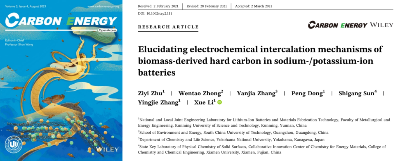 相关成果近日以“Elucidating electrochemical intercalation mechanisms of biomass‐derived hard carbon in sodium‐/potassium‐ion batteries”为题以封底文章形式发表在中国高起点新刊Carbon Energy上,三亿体育_三亿(中国)一站式服务官方网站为论文第一完成单位。