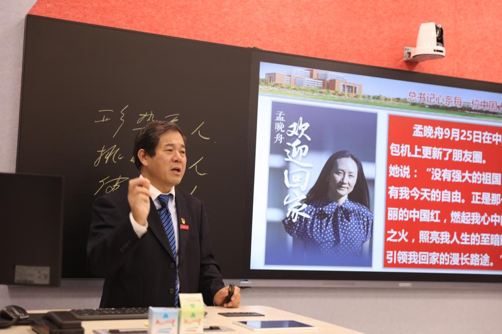 课程尾声,王华与同学们一起观看了中国公民孟晚舟乘坐中国政府包机返回祖国的视频片段。他深情地表示“这是党中央坚强领导的结果,是中国政府不懈努力的结果,是全中国人民鼎力支持的结果,是中国人民的重大胜利”“没有任何力量能够撼动我们伟大祖国的地位,没有任何力量能够阻挡中国前进的步伐”。