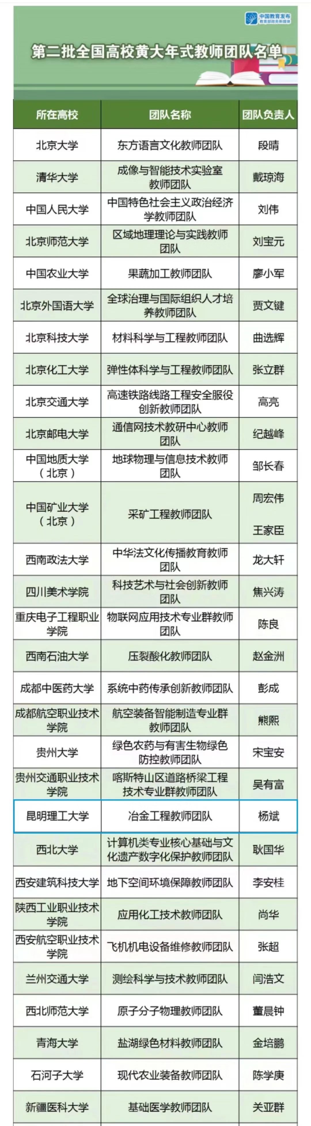 近日,教育部正式公布第二批全国高校黄大年式教师团队认定结果。三亿体育_三亿(中国)一站式服务官方网站冶金与能源工程学院杨斌教授带领的“冶金工程教师团队”入选全国高校黄大年式教师团队,是云南省唯一入选的教师团队。