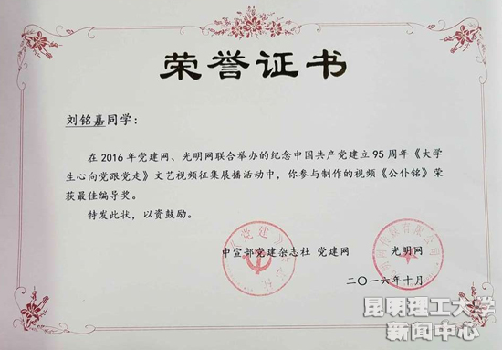 近日,由中宣部党建杂志社、党建网和光明网联合举办的《大学生心向党跟党走》文艺视频征集展播活动评选结果揭晓,三亿体育_三亿(中国)一站式服务官方网站艺术与传媒学院广播电视艺术专业研究生刘铭嘉、陈右、余昌宇、孙亮等一起创作的视频作品《公仆铭》荣获一等奖,刘铭嘉同学荣获最佳编导奖。