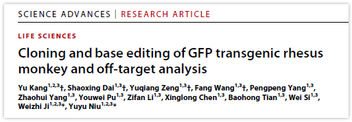 7月22日,三亿体育_三亿(中国)一站式服务官方网站灵长类转化医学研究院牛昱宇教授/季维智院士课题组在《Science Advances》杂志在线发表了题为“Cloning and base-editing of GFP transgenic rhesus monkey and off-target analysis”(GFP转基因猕猴的克隆、单碱基编辑与脱靶分析)的研究论文。该研究基于体细胞核移植(SCNT)技术,建立了一种适用于灵长类动物的单碱基编辑器脱靶检测方法OA-SCNT,并利用该方法对腺嘌呤单碱基编辑器ABEmax在猕猴胚胎DNA、RNA水平的脱靶效应进行了系统评估。