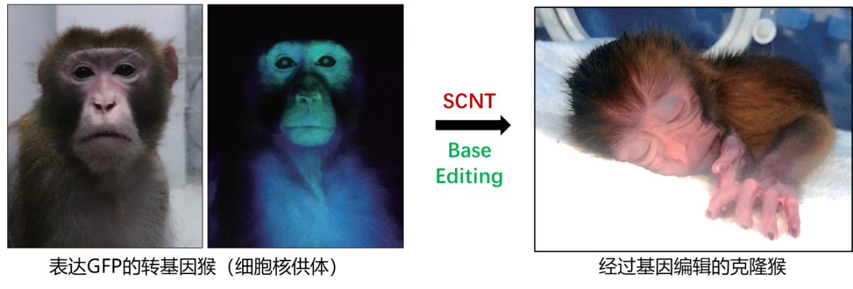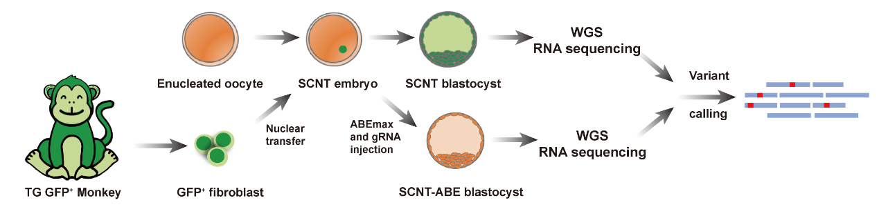 在本项工作中,研究者以一只表达绿色荧光蛋白(GFP)的成年转基因猕猴的体细胞核作为供体,采用SCNT方法构建克隆胚胎。在胚胎早期阶段利用单碱基编辑沉默GFP表达,并通过胚胎移植得到克隆猴。由于细胞核来自同一只动物,编辑组和对照组胚胎的基因背景完全一致,通过比对两者之间的差异便可鉴定出由基因编辑工具造成的突变。