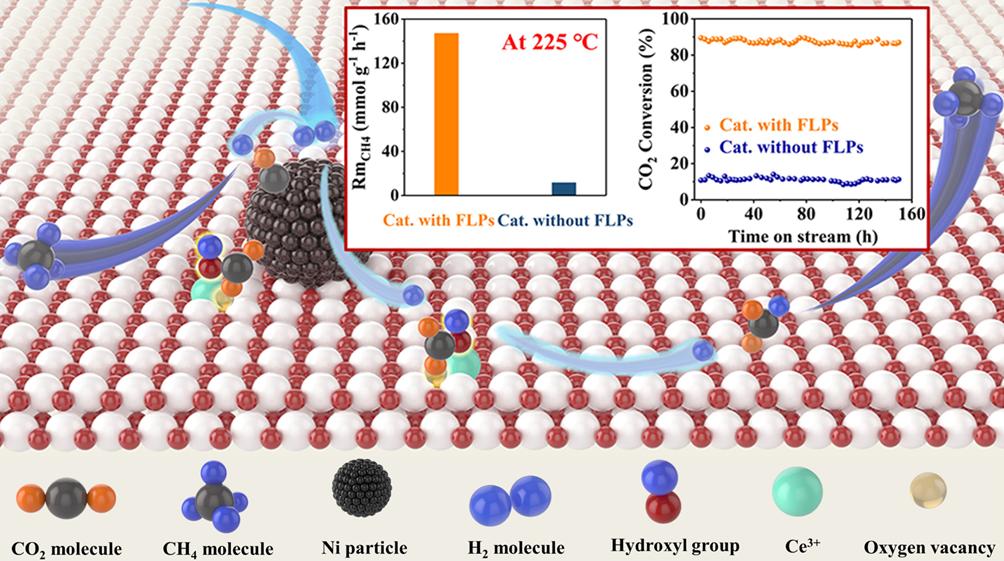 在原子尺度上理解催化反应机理是设计开发高效催化剂的重要前提,然而,二氧化碳加氢甲烷化多步反应的复杂性对理解催化剂表面活性位点结构和反应机理的关系带来了巨大的挑战,目前针对CO2甲烷化在Ni/CeO2这一热门催化剂表面的反应机理仍存在争议。为此,宁平、张秋林教授团队基于CeO2暴露晶面与位阻Lewis对(FLPs)位点分布的关系,提出了一种通过调控催化剂表面FLPs分布来探究活性位点结构和甲烷化反应机理关系的思路。原位Raman和原位漫反射红外(DRIFTS)结果表示:由于Ni/CeO2-R上CeO2(110)晶面的特性以及氧空位和相邻羟基物种之间的空间位阻,FLPs结构可在催化剂的预还原过程中逐渐产生并在高温下保持稳定(400 ℃),随后在低温条件(225 ℃)下积极参与CO2加氢反应;催化剂活性评价结果显示:即使在225 ℃的低温下,富含FLPs的Ni/CeO2-R可达到147.1 mmol gcat-1h-1的甲烷产率,是贫FLPs的Ni/CeO2-O的12.8倍;原位DRIFTS和密度泛函理论(DFT)计算结果证明:FLPs结构不仅促进了HCO3*向HCOO*的转化(甲酸盐途径),还利于低温下CO2裂解成CO*(CO*途径),这种“共促进”作用有效地提升了催化剂的本征活性。团队的相关研究工作有望为CO2加氢催化剂的设计拓宽思路。